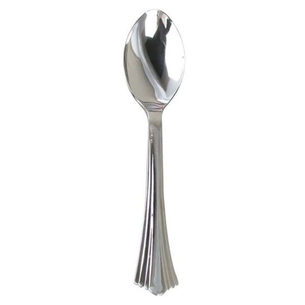 Stevige plastic opscheplepels in de kleur zilver. De lepels hebben een uitstraling van metalen bestek. De lepels zijn 25 cm lang. Een pak bevat 3 lepels.