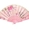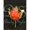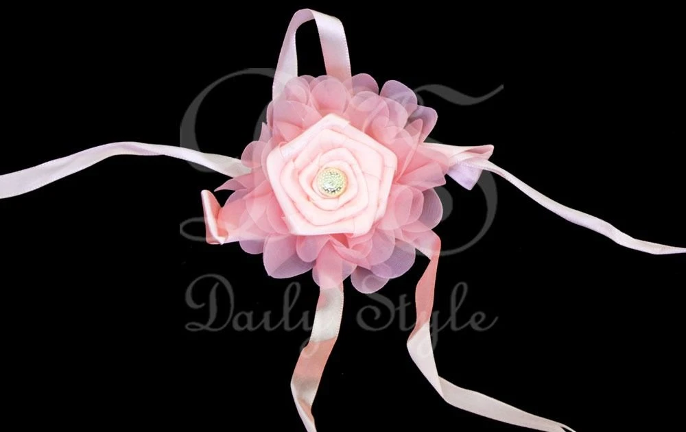 Roze corsage met veiligheidsspeld. Het bloemstuk heeft een diameter van 8,5cm en wordt omsierd door 2 stroken satijnlint van circa 32cm lang.