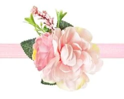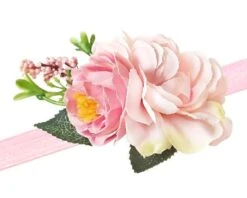 Roze polscorsage met kunst pioenrozen, groene bladeren, parels en lint van organza. Het bebloemde deel is 9,5cm lang en 8cm breed. Leuk voor de bruidsmeisjes of gasten van een babyshower!