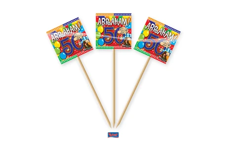 Vrolijke vlaggenprikkers voor de jarige Abraham. Het vlaggetje is 3,6×3,3cm groot en is bevestigd aan een prikkertje van 6,5cm lang. Verpakt per 50 prikkers