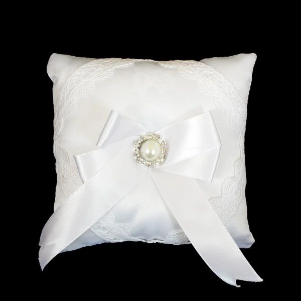 Satijnen ringkussen met kant en strass decoratie. De afmetingen zijn 11x11cm.