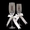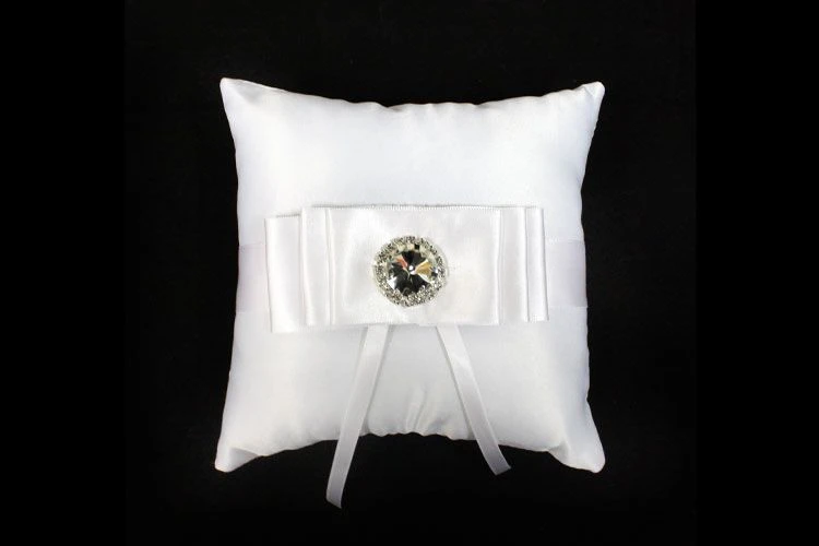 Satijnstoffen ringkussentje, versierd met satijnlinten en diamantjes. De ringkussen heeft een afmeting van 15×15 cm.
