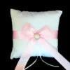 Satijnen ringkussen met een strikje en parel/strass decoratie. De ringkussen heeft een afmeting van 15 x 15 cm.
