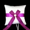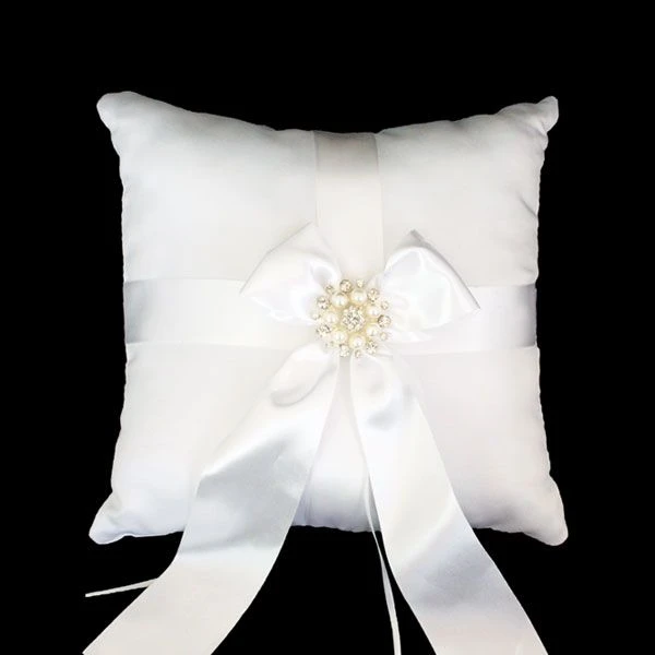 Satijnen ringkussen met parels en strass decoratie op een strikje. De ringkussen heeft een afmeting van 20 x 20 cm.