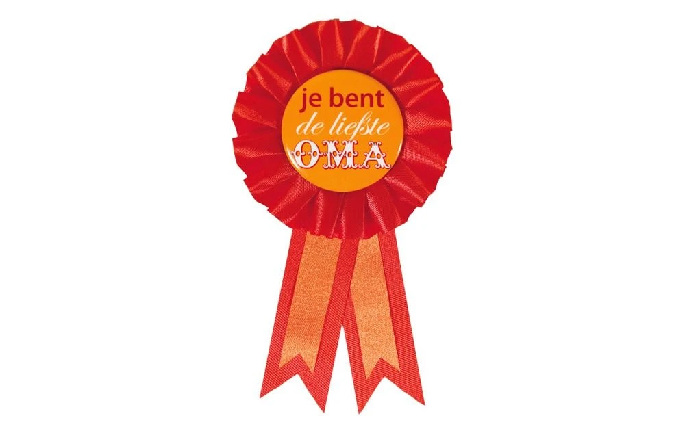 Rozet met de tekst ‘je bent de liefste OMA’. De rozet heeft een diameter van 7,8 cm met 3 slierten lint van max 8.5 cm als aanhangsel.