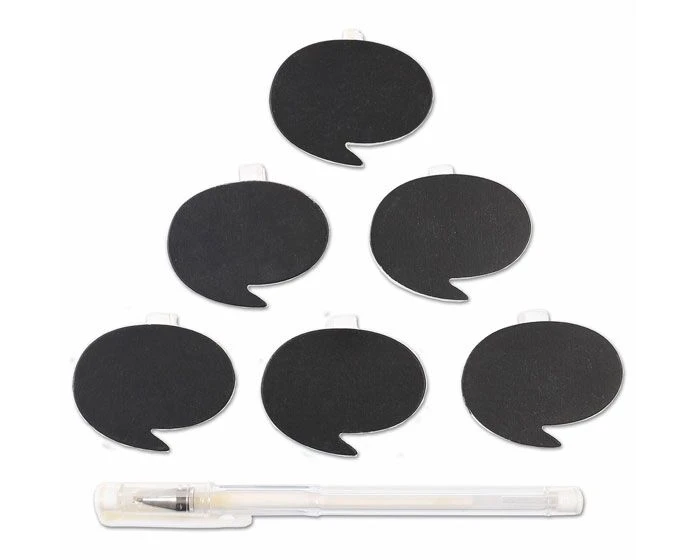 Kleine houten schoolbordjes in de vorm van een tekstballon op knijpers. Inclusief pen. Een set bestaat uit zes schoolbordjes en een pen.