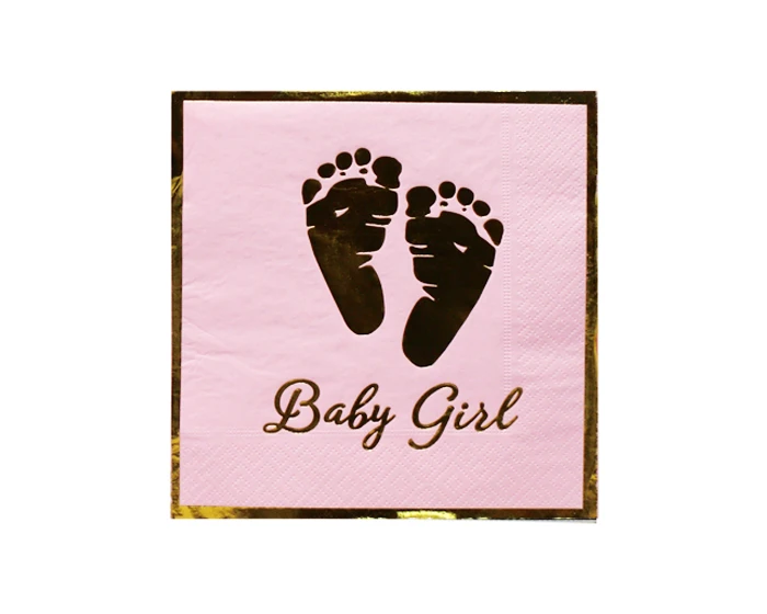 Luxe roze servetten met een afdruk van babyvoetjes en de tekst ‘Baby Girl’ in goudfolie. De servetten hebben uitgevouwen een afmeting van 33x33cm. Elke verpakking bevat 20 servetten.