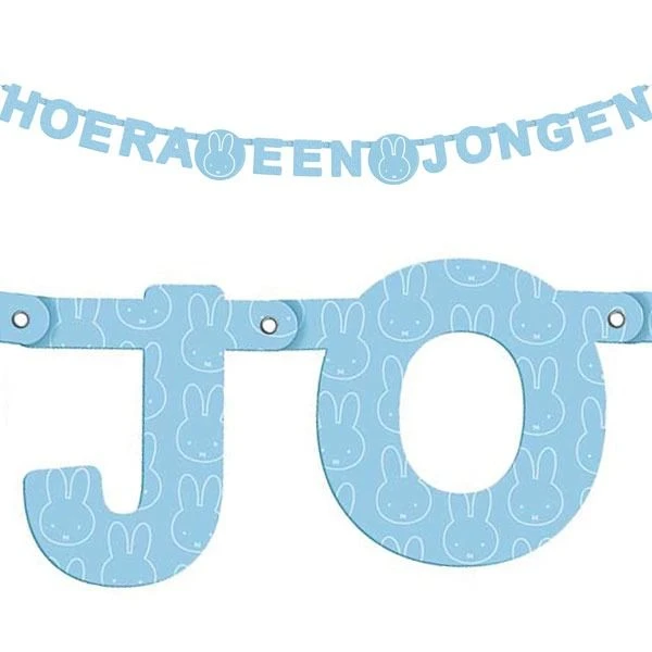 Kartonnen letters die samen de tekst ‘Hoera een jongen’ vormen. De slinger is 11cm hoog en 1,7m lang.