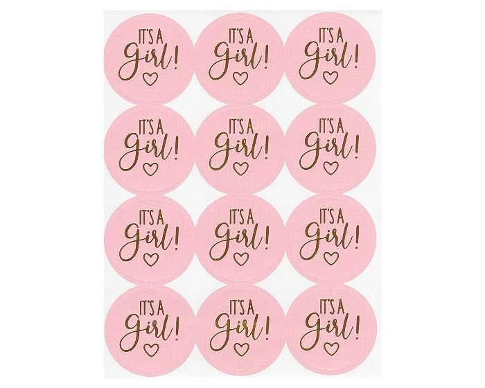 Ronde roze stickers met de tekst ‘It’s A Girl!’ in gouden letters. De stickers hebben een doorsnede van 3cm. Eén verpakking bevat 24 stickers.