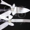 Taartset bestaande uit een mes en een taartschep. Beide met transparante handvaten en een parel/strass decoratie op strik. De mes en taartschep zelf zijn van roestvrij staal. De taartschep is ca. 28cm lang en de mes is ca. 33cm lang.