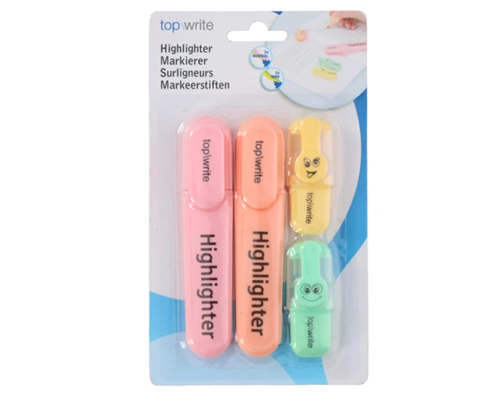 Set van vier markeerstiften in pastelkleuren. De set bestaat uit twee grote en twee kleine markeerstiften.