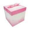 Wit vouwdoosje van karton met roze siermotief en satijnlint. De doosjes worden plat geleverd en is heel simpel in elkaar te vouwen. Het doosje is in gevouwen vorm 9x9x5,5cm (LxBxH). Het bijgeleverde satijnlint is al op maat gesneden. Verpakt per 24 stuks.