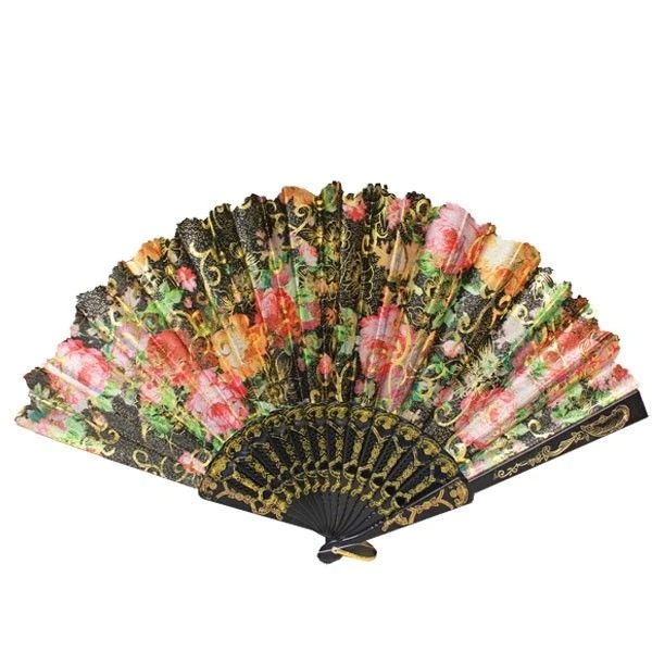 Papieren glimmende waaier met bloemen in de kleur zwart. De frame van de waaier is van plastic. De waaier is 23 cm lang.