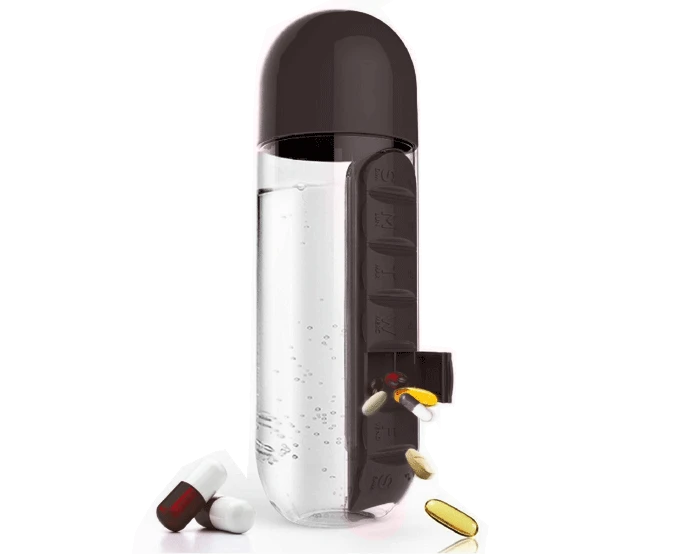 Waterfles met daarin een pillendoosje voor alle dagen van de week. Het pillendoosje kan er uit geschoven worden zodat deze ook los gebruikt kan worden en natuurlijk om de fles grondig te kunnen reinigen. Handig voor thuis, tijdens het sporten en onderweg omdat je altijd water binnen handbereik hebt om je benodigde medicijnen in te nemen.