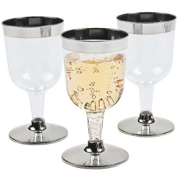 Hard plastic wijnglazen met metallic zilveren rand en voet. Deze champagneglazen geven een extra luxe tintje aan je feest!
