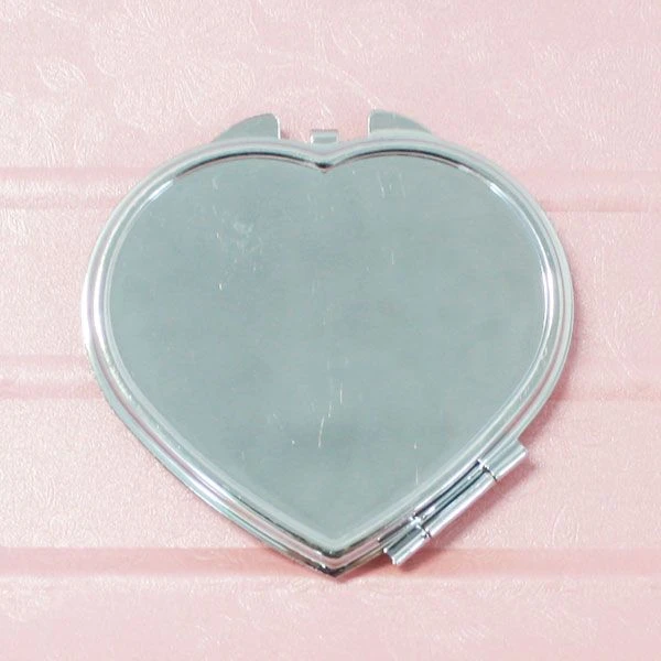 Simpel zilveren zakspiegel in hartvorm. De spiegel is 6,5×7,5cm groot en heeft (geopend) aan twee zijdes spiegelglas.