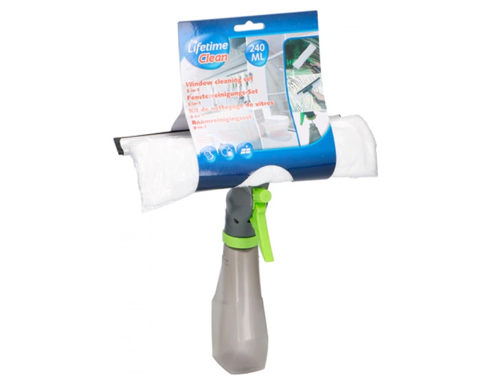 Lifetime Clean 3-in-1 raamreinigingsset is ideaal voor de schoonmaak van ramen. Deze set reinigt, spuit en droogt. Het bevat een spuitfles (240 ml), trekker 24,5cm en een reinigingsdoek 25 x 7 cm.