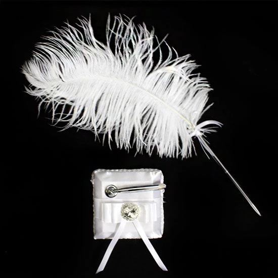 Receptiepen in de vorm van een veer met een houder. De pen is 42cm lang en 17cm breed (incl. veer). De afmetingen van de houder zijn 9,5×9,5×2,5cm (LxBxH).